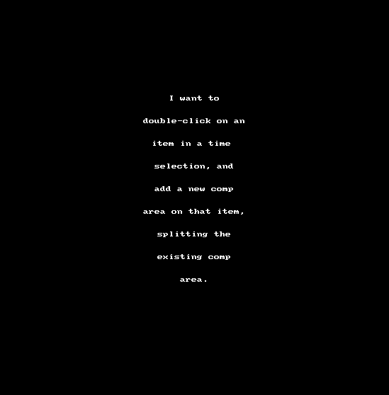Has anybody flagged this before? NB This behaviour only happens with 'Allow editing source media while comping' is enabled. Without it, clicking on a time-selected item with comping on works as expected. (You don't even have to double-click, it's a breeze). Long read: What I'm trying to do. With source item comp editing enabled, if you have a few takes in lanes, some of which are only fragments (inserts), you can set a time selection to one of these, then right-click the comp area and select 'Add comp area at time selection' which splits the comp area at the original item - you then select your insert at the comp area and it's comped. Great, if clunky. What I've tried to do using mouse mods is enable 'double-click on fixed lane comp area: add comp area at time selection for lane under mouse', which I hoped would eliminate a right-click, a click and a click in the target lane. What happens (see gif) is that the comp area gets a single split at the mouse, which does not respect the time selection or transfer to the target lane.